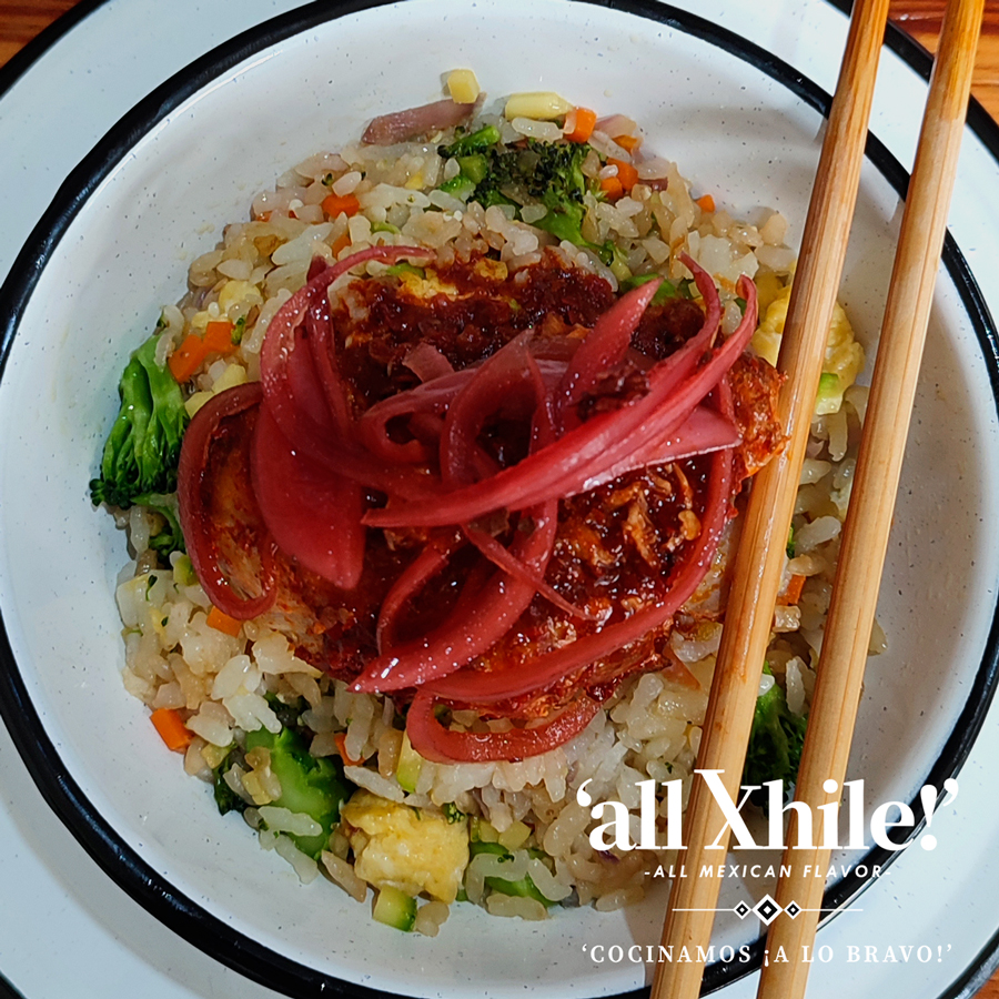 Este platillo japonés de arroz frito con verduras, nori y huevo se mezcla perfectamente con la tradicional birria
